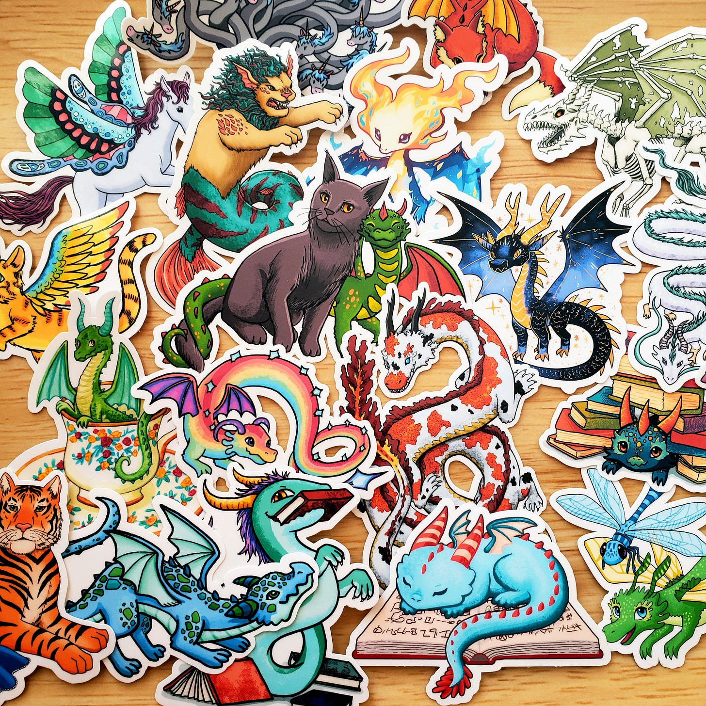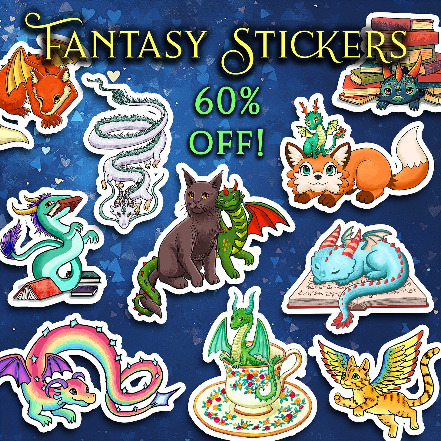 I’ve got a sticker sale going right now for packs of either 10 or 20 mystery fantasy stickers. They’re 60% off, which is pretty big. I don’t ever do that, normally. You don’t know exactly which stickers you’ll get, but that’s part of the fun! They will be my fun fantasy art that I already know you all love, and each one will be unique from others in your set. No repeats.